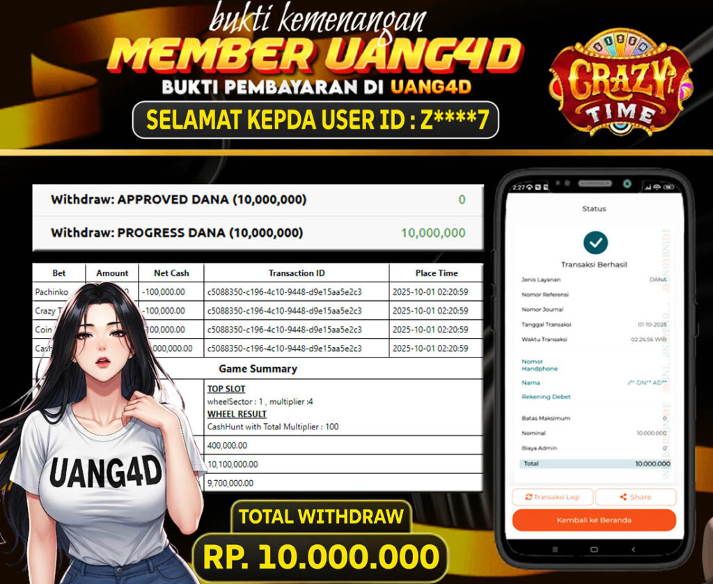 Setiap hari, member UANG4D berhasil meraih jackpot besar dari berbagai macam permainan livecasino ternama yang kami sediakan, seperti Roullete, Dragon & Tiger, Qiu Qiu dan masih banyak lagi. Kami secara rutin menampilkan bukti screenshot atau rekapan kemenangan yang berhasil diraih, mulai dari kemenangan ratusan ribu hingga puluhan juta rupiah. Semua slip kemenangan ini kami hadirkan untuk membuktikan bahwa di UANG4D, peluang menang itu nyata.